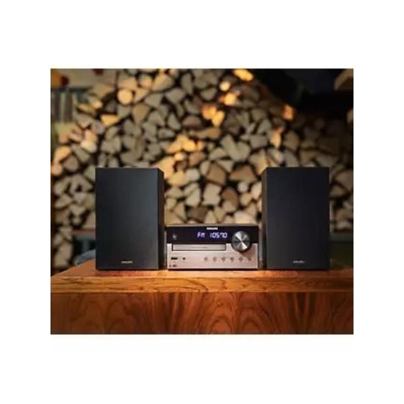 Questo elegante sistema micro consente di riprodurre in streaming playlist, riprodurre CD e ascoltare le radio DAB+ e FM. Il sintonizzatore radio digitale con 20 preselezioni assicura una ricezione eccezionalmente nitida, mentre il lettore CD può leggere CD MP3 e CD registrati.Altoparlanti bass reflex. Toni bassi più intensiQuesti altoparlanti da scaffale assicurano un audio nitido e bassi ottimali, grazie alla combinazione di woofer, tweeter e porte bass reflex. La potenza massima in uscita di 60 W offre un audio potente in qualsiasi stanza. Perfetti in salotto o in un soggiorno open space.Design classicoL'unità centrale e i cabinet degli altoparlanti bicolore richiamano il design dei componenti Hi-Fi "old style". La manopola del controllo del volume testurizzata ricorda il funzionamento dei vecchi sistemi analogici e la parte frontale dell'unità è dotata di pulsanti per la riproduzione e la selezione della sorgente.Controllo audio digitale. Scegli uno stile audio predefinitoMusica hip-hop, corale, sinfonica o rock? Qualunque sia la tua preferita, la funzione di controllo audio digitale di questo sistema micro ti consente di apprezzarla al massimo. Scegli uno degli stili audio predefiniti, progettati per esaltare al massimo la tua musica.Sentiti davvero a casaQuesto sistema micro con alimentazione CA valorizza qualsiasi ambiente. Il Bluetooth wireless ha una portata di 10 m ed è possibile caricare un dispositivo smart tramite la porta USB. Grazie al telecomando facile da usare, le funzioni principali sono a portata di mano.