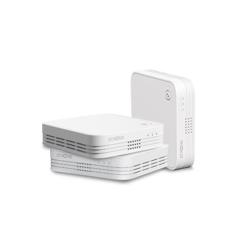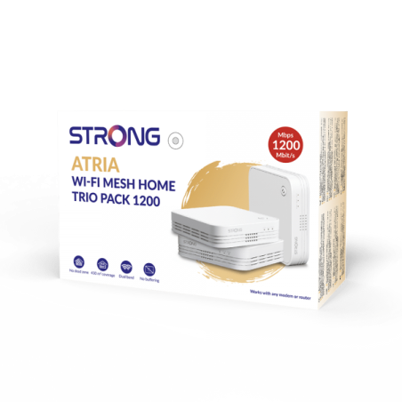 ATRIA Wi-Fi Mesh Home Trio Pack 1200 di STRONG combina la tecnologia Mesh con il potente standard Wi-Fi 802.11ac per la massima velocità e copertura in casa. Questo pacchetto, contenente 3 ATRIA Mesh Extender 1200, sostituisce la vostra rete Wi-Fi attuale senza cambiare il vostro router o modem e porta una rete Wi-Fi super-veloce ed un roaming senza interruzioni con una velocità fino a 1200 Mbit/s con una copertura fino a 450 m². A seconda delle dimensioni della vostra casa, è possibile aggiungere fino a 3 ulteriori ATRIA Mesh Extender 1200 (6 ATRIA Mesh Extender 1200 coprono un’area fino a 900 m²). Gestisci la tua rete Wi-Fi Mesh semplicemente con un dito grazie alla App ATRIA Mesh disponibile per dispositivi Android e iOS.