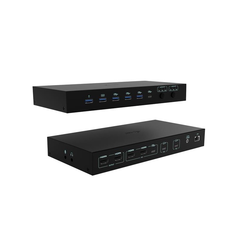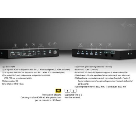 Docking station KVM premium per un massimo di tre dispositiviQuesta docking station ad alte prestazioni consente il collegamento simultaneo di un massimo di tre dispositivi host: un PC o una console di gioco e due notebook o tablet. Completamente compatibile con dispositivi dotati di porte USB-C, USB4 o Thunderbolt 3/4/5. I PC o le console possono essere collegati tramite HDMI e USB.Supporta fino a due monitor esterni, che possono visualizzare contenuti da un unico host o ciascuno da uno diverso, ideale per il multitasking o per lavorare su più sistemi.Grazie a due porte USB roaming, è possibile condividere senza problemi la tastiera e il mouse tra due host contemporaneamente, aumentando il comfort e la produttività.La stazione dispone anche di quattro porte USB ad alta velocità (10 Gbps) per le periferiche, oltre a una connettività completa che include porte GLAN, audio e microfono.L’alimentazione intelligente supporta una ricarica fino a 92 W per un singolo laptop o 45 W ciascuno quando si alimentano due dispositivi contemporaneamente.Grazie ai comodi selettori di uscita, è possibile scegliere facilmente se entrambi i monitor devono duplicare un singolo host o funzionare in modo indipendente su due host, ideale per flussi di lavoro paralleli. Supporto per un massimo di 3 dispositivi host esterni (2 laptop/tablet e 1 console di gioco/PC) Collegamento di un massimo di 2 monitor esterni con risoluzione fino a 4K/60 Hz * 2 porte USB intelligenti per tastiera e mouse con funzione di roaming (condivisa) 4 porte USB veloci con velocità di 10 Gbps (3 USB-A e 1 USB-C, che possono anche caricare fino a 15 W) Porta LAN con velocità fino a 1 Gbps (10/100/1000 Mbit) 2 porte da 3,5 mm per audio e microfono Alimentazione 1x 92 W o 2x 45 W 2 pulsanti OUTPUT indipendenti per selezionare il dispositivo host (il pulsante OUTPUT 1 funge anche da interruttore di alimentazione della docking station) * macOS non supporta il Multi-Stream Transport (MST) per l’uscita video multi-display. Di conseguenza, quando si utilizza macOS, la stessa immagine verrà riprodotta su entrambi i monitor collegati.