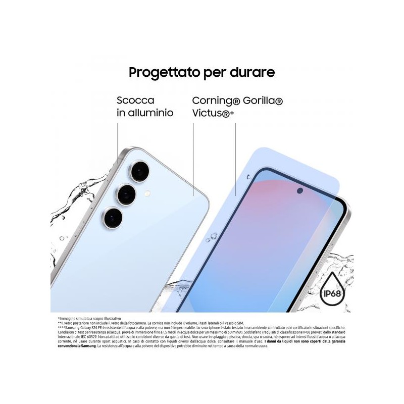Con il vetro Corning® Gorilla® Glass Victus®+ a proteggere il tuo telefono sia frontalmente che sul retro, Galaxy S24 FE è progettato per durare. Inoltre, è certificato con protezione IP68 contro polvere e acqua.