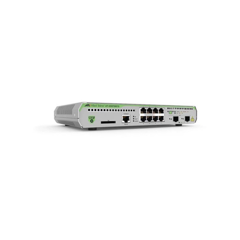 Allied Telesis 8 x 10/100/1000T POE+ ports and 2 x combo ports (100/1000X SFP or 10/100/1000T Copper), 124W POE capacity, Fixed one AC power supply, UK Power Cord