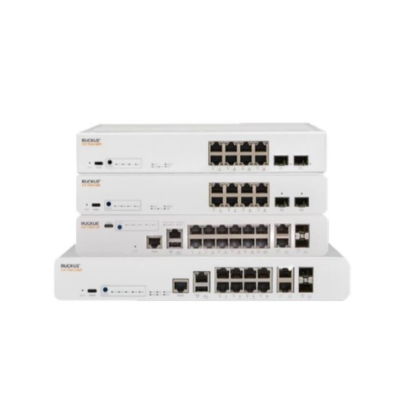 ICX 7150 Compact Switch, 12x 10/100/1000 PoE+ ports, 2x 1G RJ45 uplink-ports, 2x 1G SFP uplink-ports upgradable to 2x 10G SFP+ with license. 124W PoE budget, basic L3 (static routing and RIP)