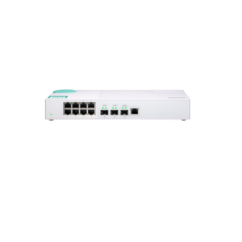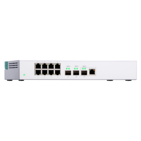 QSW-308-1C offre tre porte 10GbE SFP+ e otto porte Gigabit per il collegamento di diversi dispositivi oltre a offrire una rete ibrida ad alta velocità in ambienti domestici e uffici. Con le interfacce SFP+, è possibile usare il collegamento diretto dei cavi in rame (DAC) per il collegamento diretto ai dispositivi SFP+. È anche possibile usare i moduli transricevitore in rame 10G-SFP-T per collegare i dispositivi 10GBASE-T/NBASE-T™ mediante un cablaggio RJ45 categoria 6, 5 o 5e. La capacità di commutazione del QSW-308-1C è 76Gbps, che garantisce il potenziale completo di ciascuna porta.